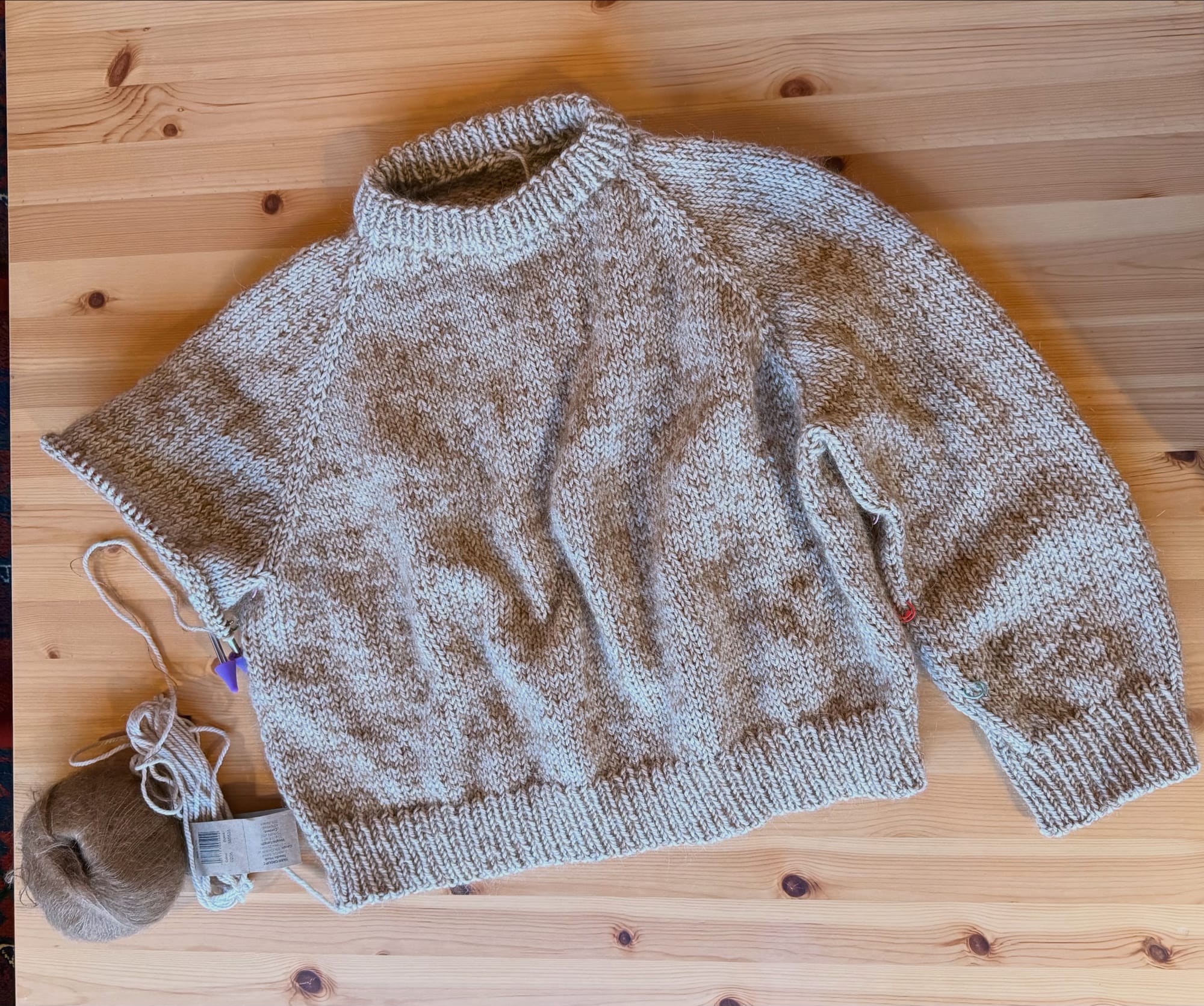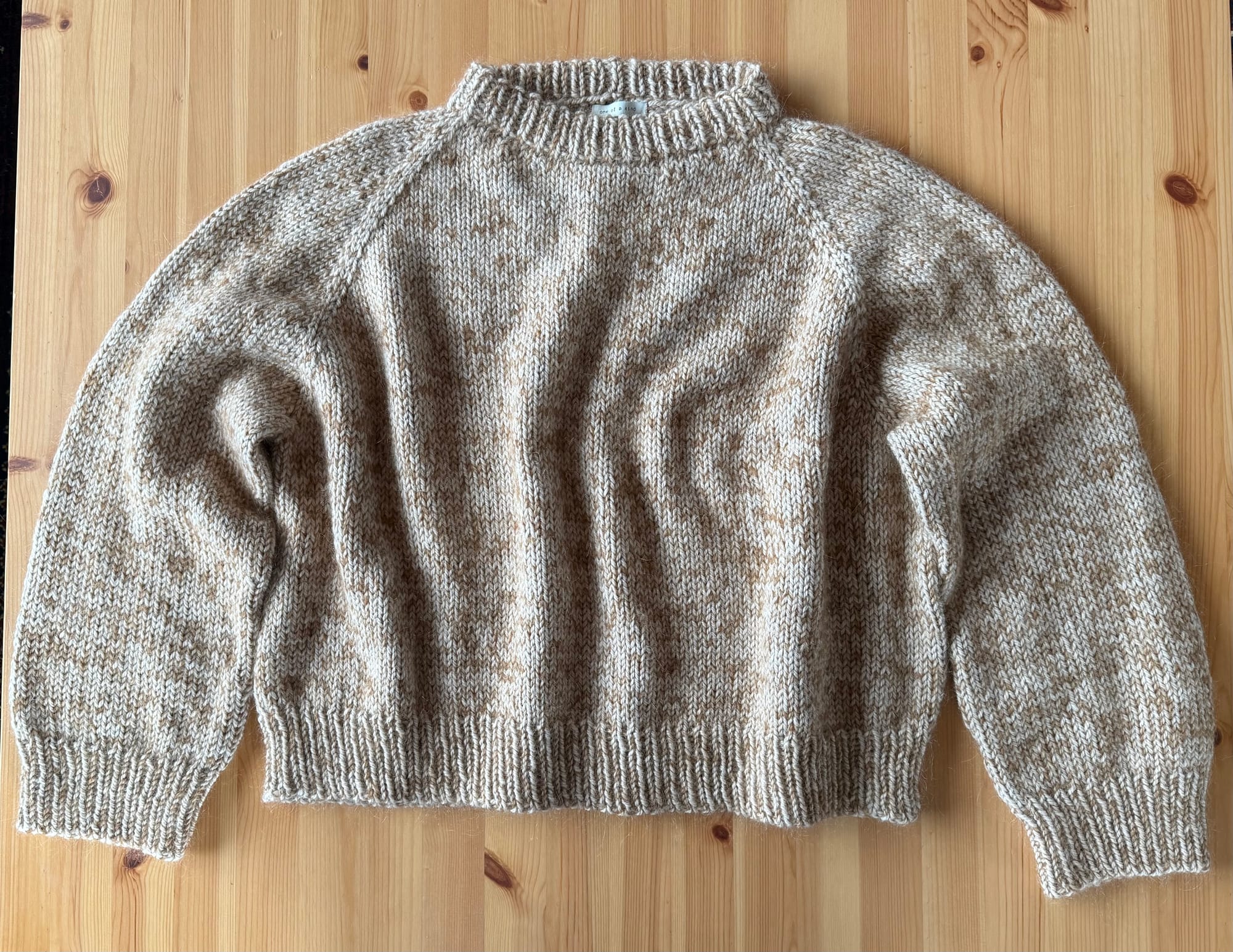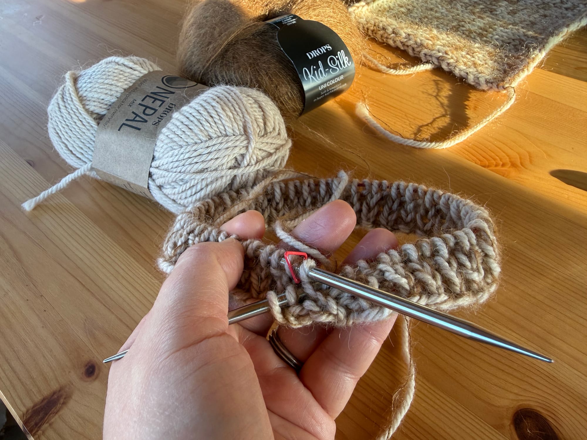Yarn: Drops Nepal in the colourway 206 Light Beige, aran weight, 65% wool, 35% alpaca. Held together with Drops Kid-Silk in the colourway 51 Toffee, lace weight, 75% mohair, 25% silk.