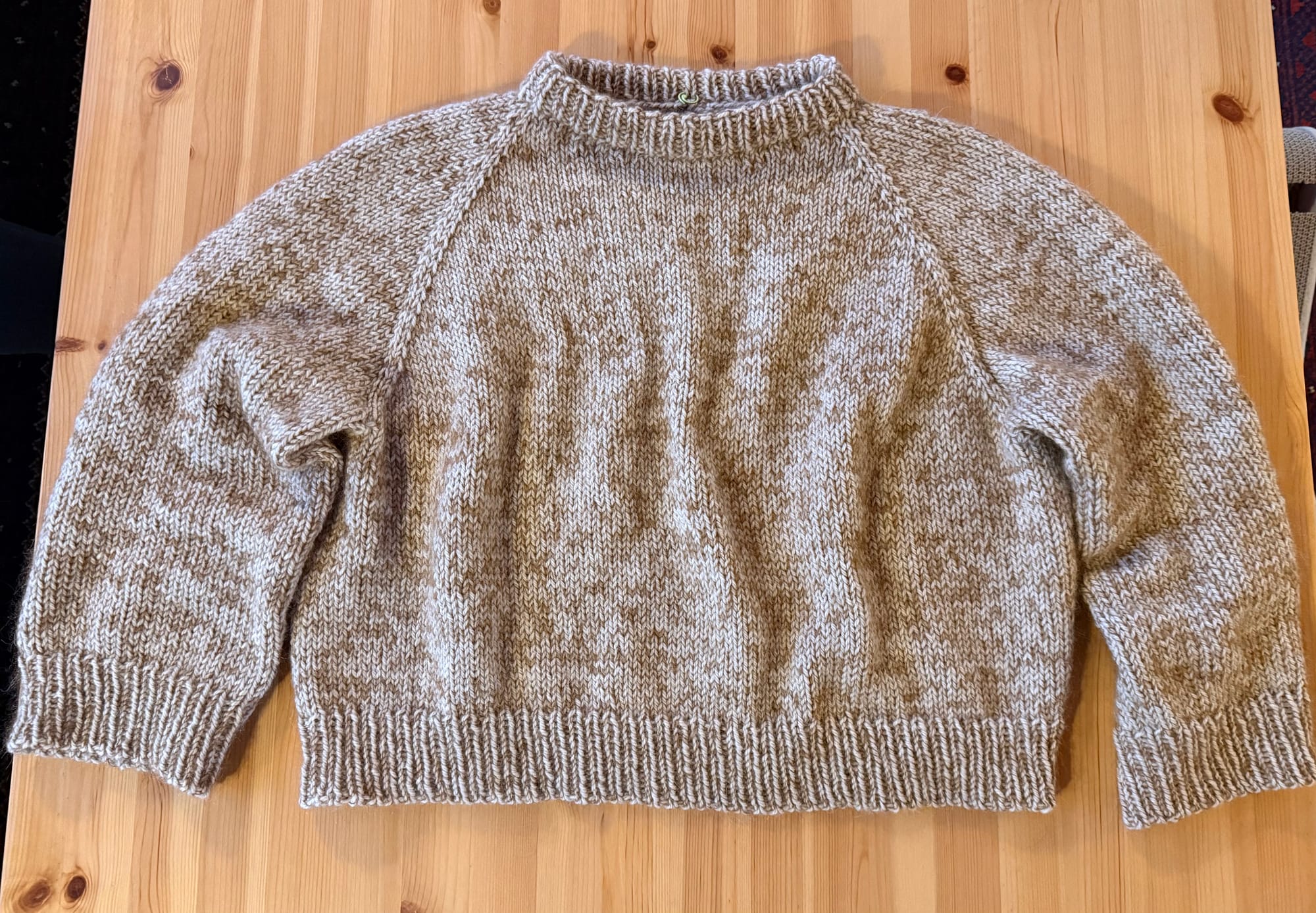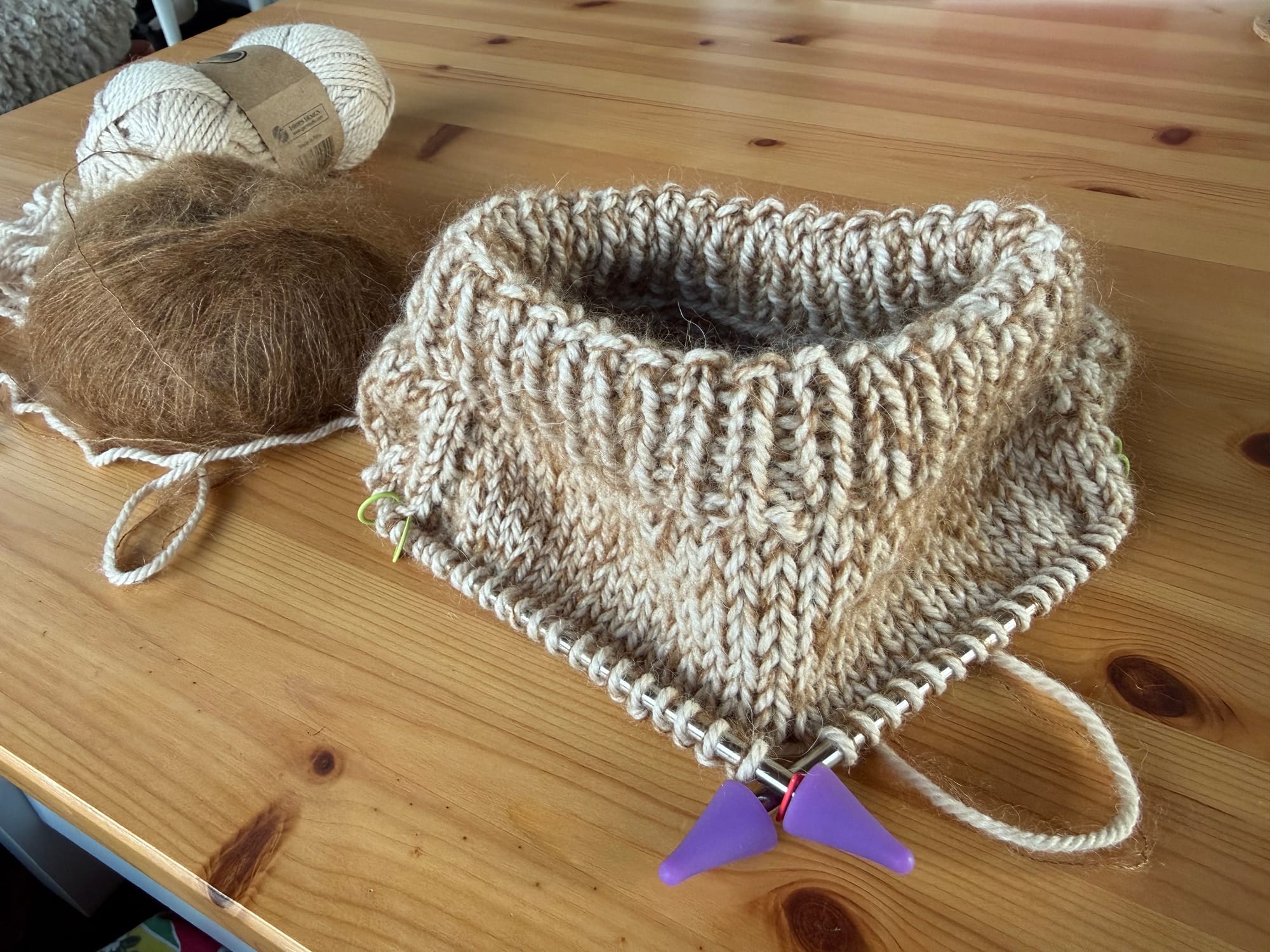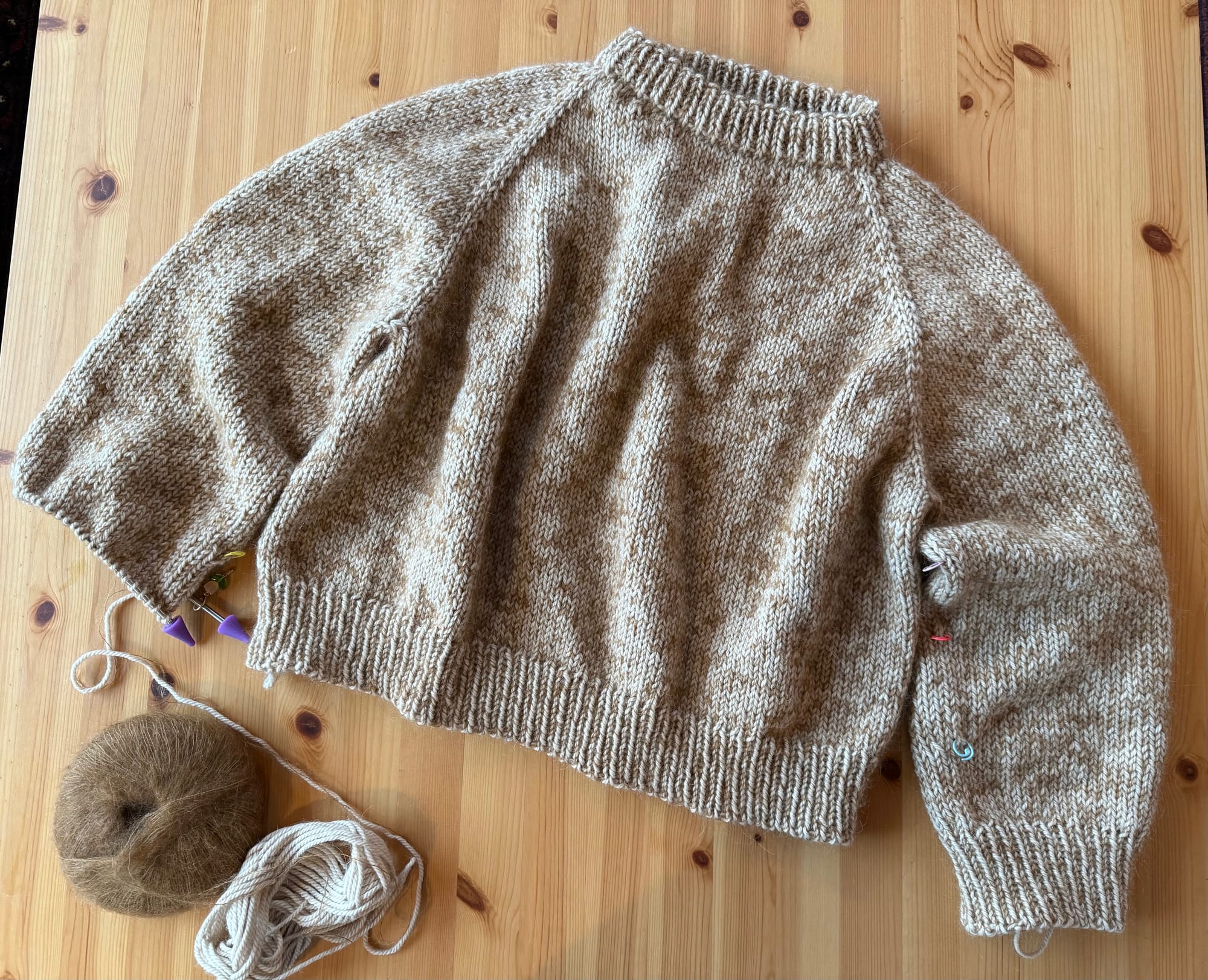 Yarn: Drops Nepal in the colourway 206 Light Beige, aran weight, 65% wool, 35% alpaca. Held together with Drops Kid-Silk in the colourway 51 Toffee, lace weight, 75% mohair, 25% silk.