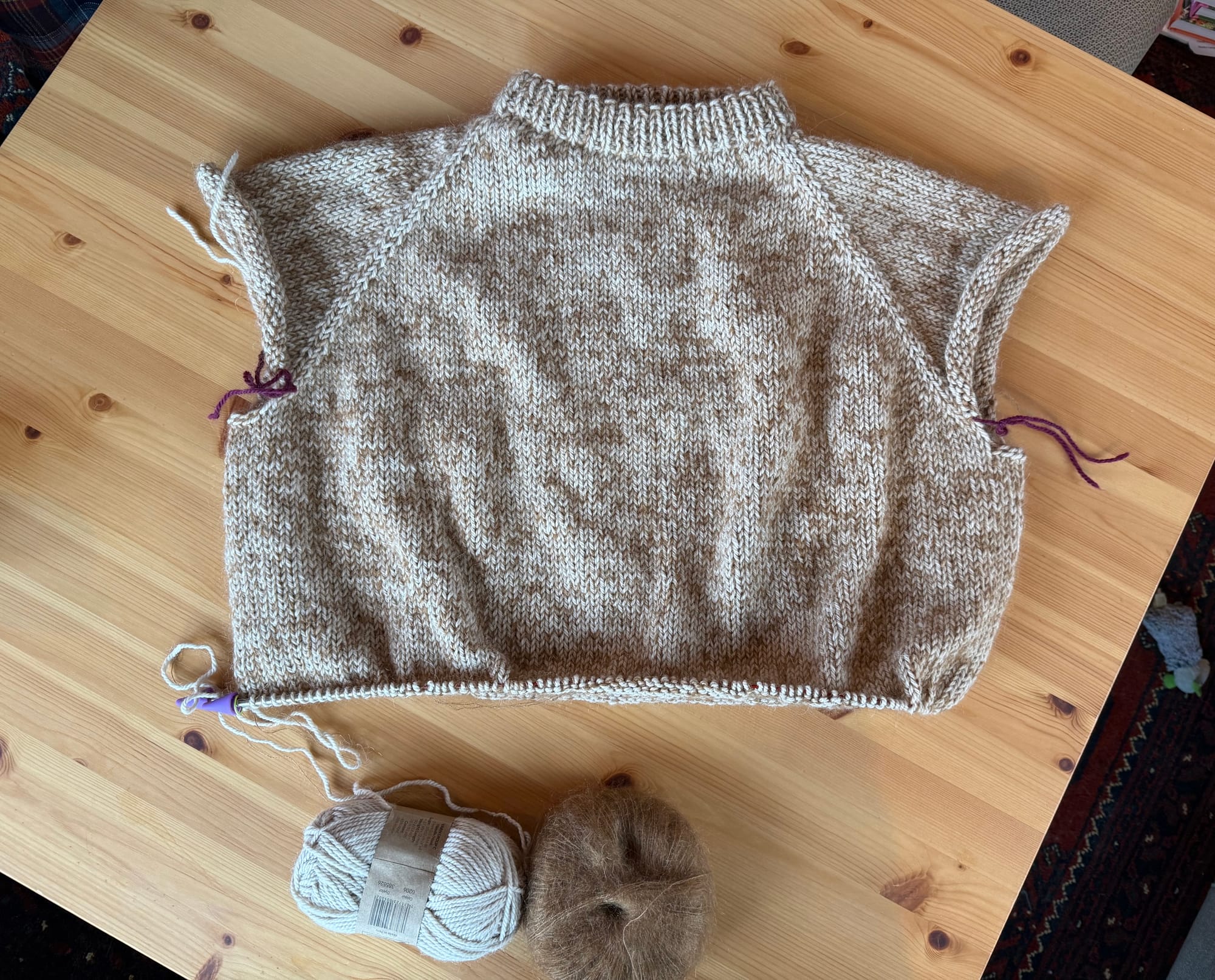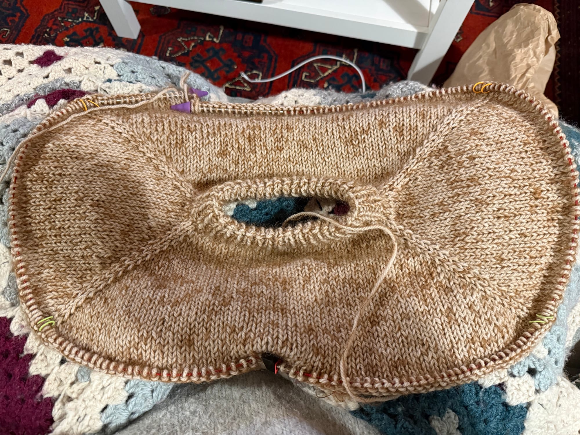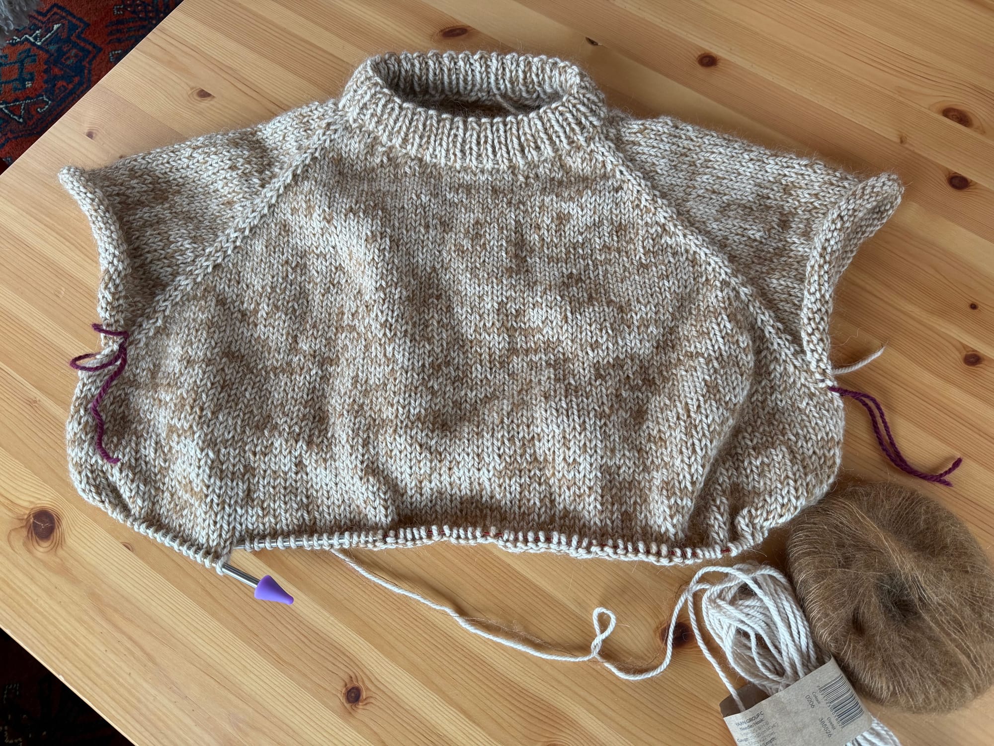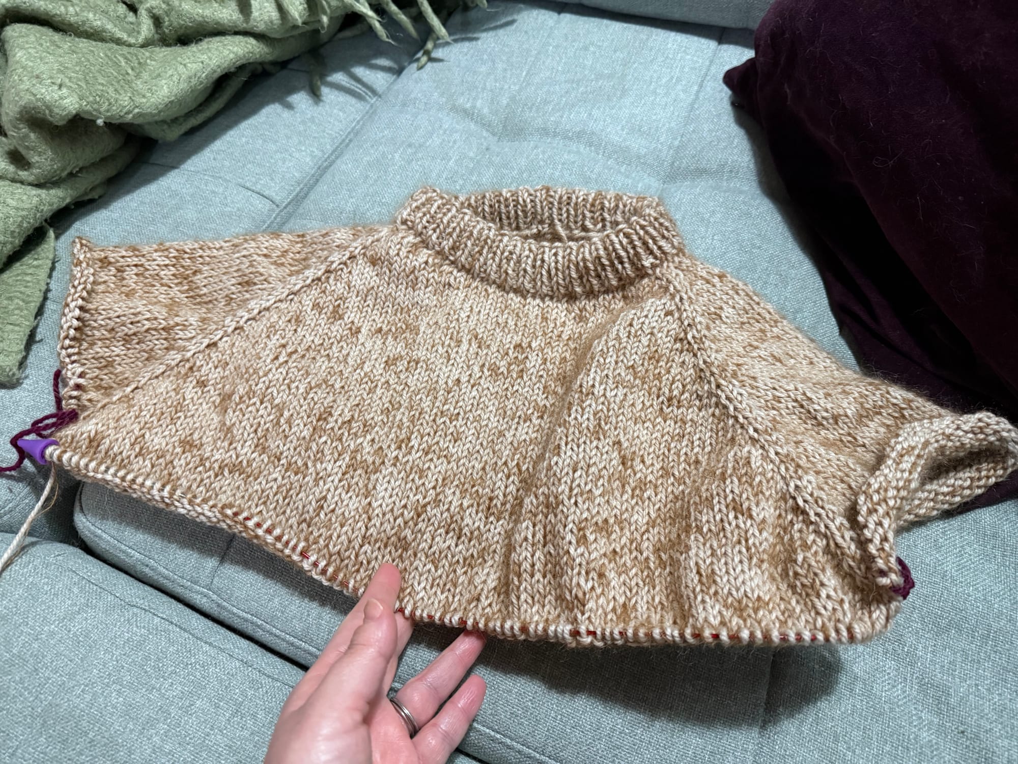 Starting raglan increases; questioning if I was doing this right because the shape looked odd to me; right after separating the body and sleeve sections and it suddenly looks like a sweater!