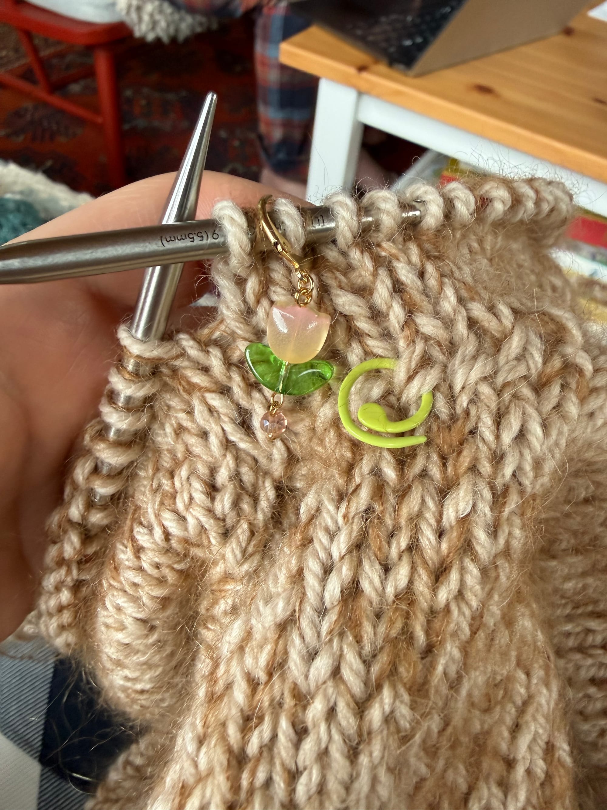 Watching the sleeves slowly grow to their final length was a lot of fun. Also, let's take a moment to appreciate this adorable tulip stitch marker I used through the entire project.