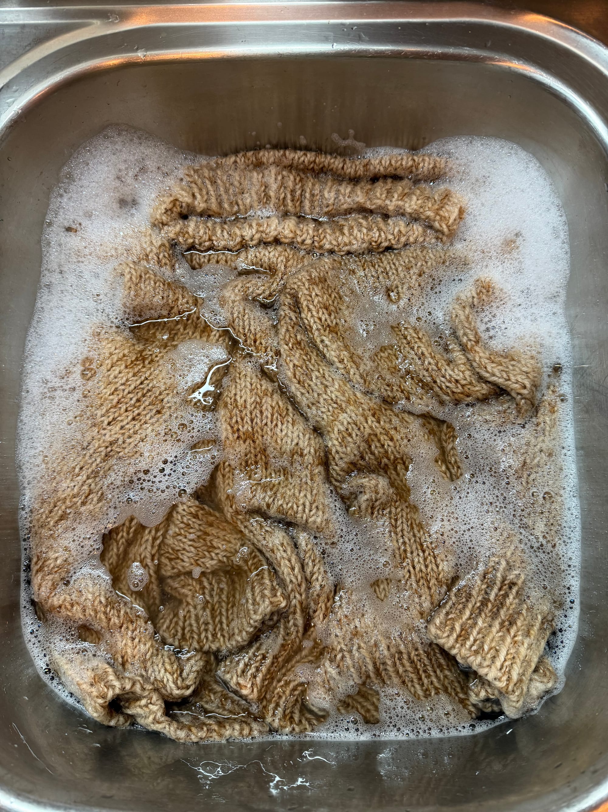 Soaking with wool wash; laying it out to dry on my blocking mats.
