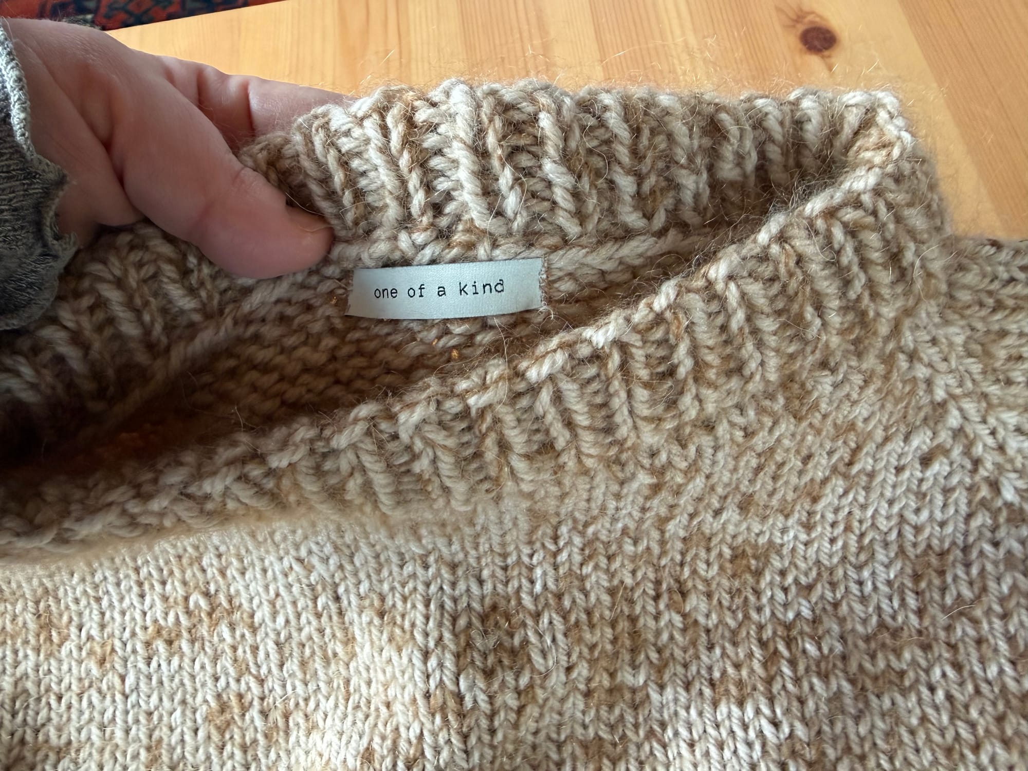 But it's finally done, and dry, and I can wear it proudly! As a finishing touch, I sewed a tag onto the center back of the neckline. I love adding tags like this to all of my sewing projects, and it's fun to be able to start adding them to knitwear too. 😄