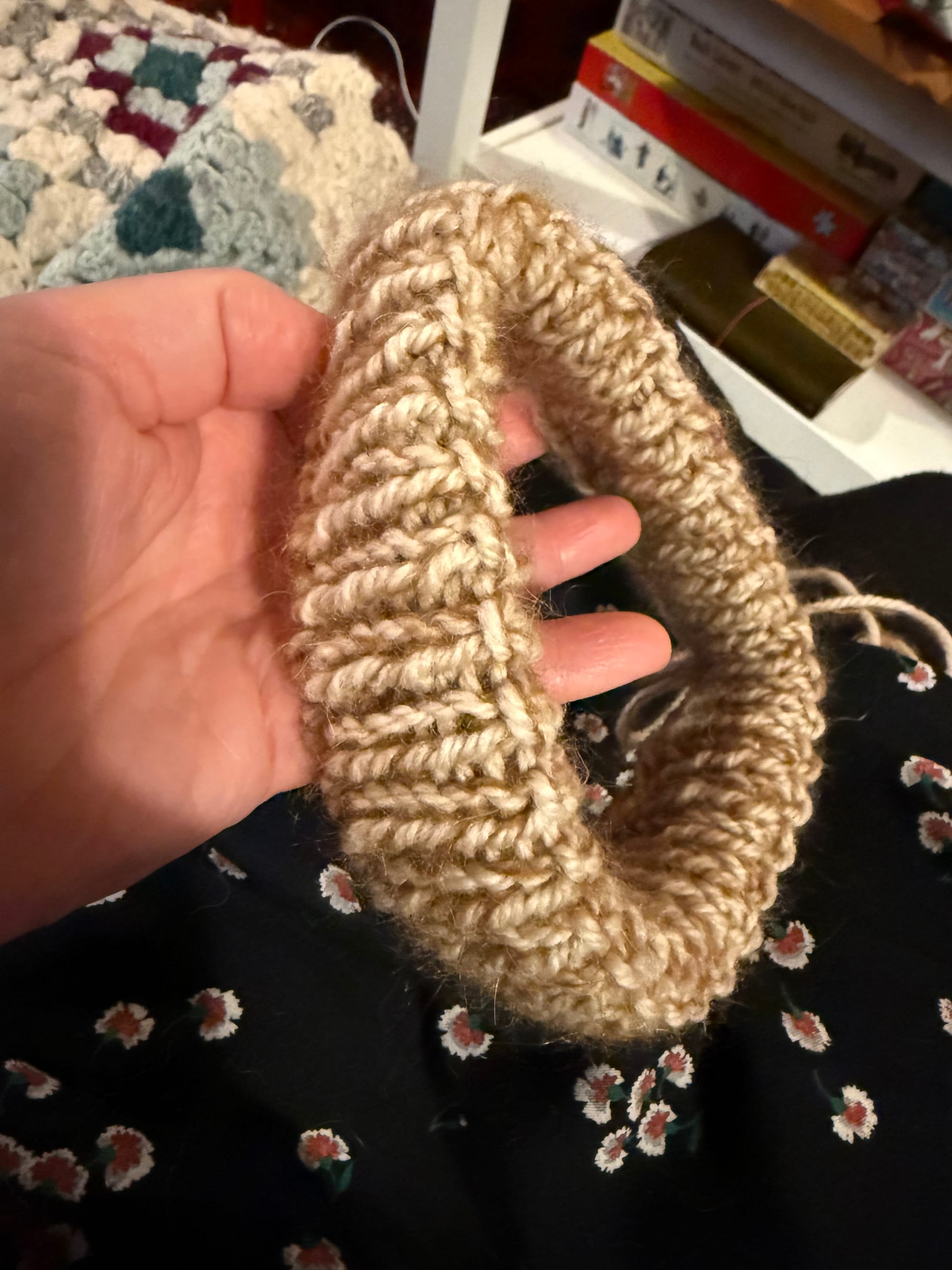 My favourite part of the entire sweater-knitting was the rounds and rounds of plain knitting that made up the body. There was no counting, no increases, nothing but knit, knit, knit. Over the next several days I picked this project up with my morning coffee or whenever we watched tv in the evenings. I found that my knitting speed increased during this time and the needles felt a lot more comfortable in my hands. I knew that I wanted this sweater to end up being slightly cropped, but when I reached the length I wanted, I was hesistant to stop knitting because I was enjoying the process so much. I did stick to my original plan for the length though, and knit the body 4 cm shorter than the pattern suggests. After knitting the body, I changed to the smaller needle size and knit 7 cm of ribbing around the bottom. I followed Florence's video tutorial for her stretchy bind-off and am really pleased with the look and flexibility of this edge. This was another part of the pattern where her video was played on repeat many, many times until the sequence of stitches finally made sense.